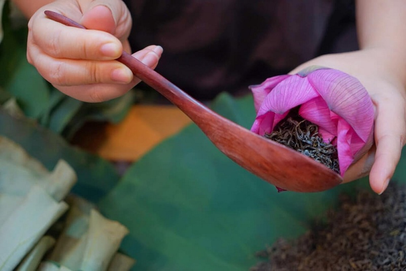 Quá trình lấy gạo sen phải thực hiện thật nhanh, thông thường chỉ trong vài giờ sau khi hoa vừa hái. Sau đó, gạo sen được đem trộn với trà rồi ủ kín theo từng lớp. Cứ mỗi một cân trà, người làm phải thêm từ 1 đến 1,2 kg gạo sen. Gạo sen giúp truyền tinh dầu sang từng sợi trà, giữ cho hương sen không bị bay đi mà ngấm sâu, bền lâu theo thời gian. Nhờ vậy, dù qua nhiều lần pha nước, vị sen vẫn đậm đà, lan tỏa rõ rệt trong từng ngụm trà.
