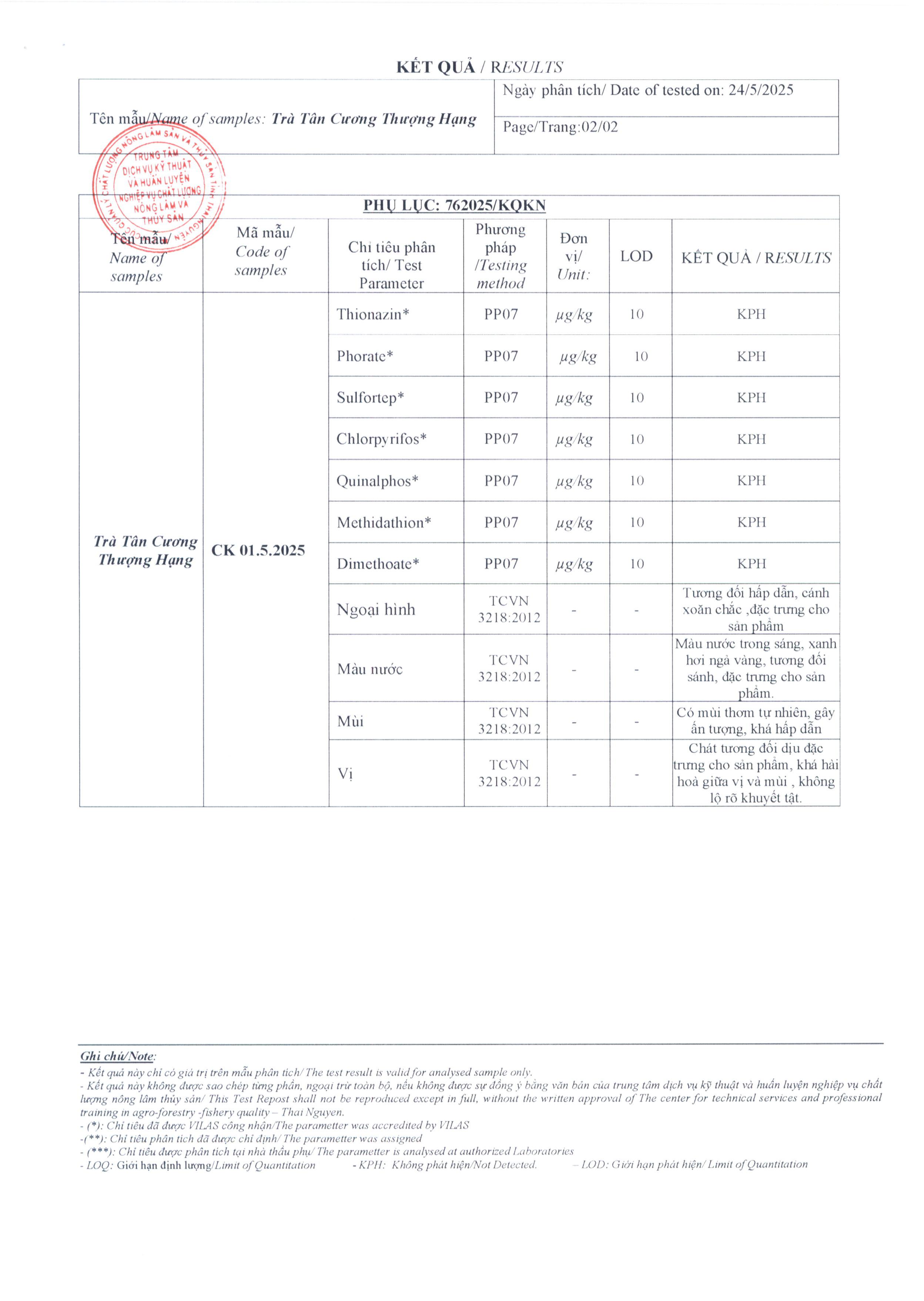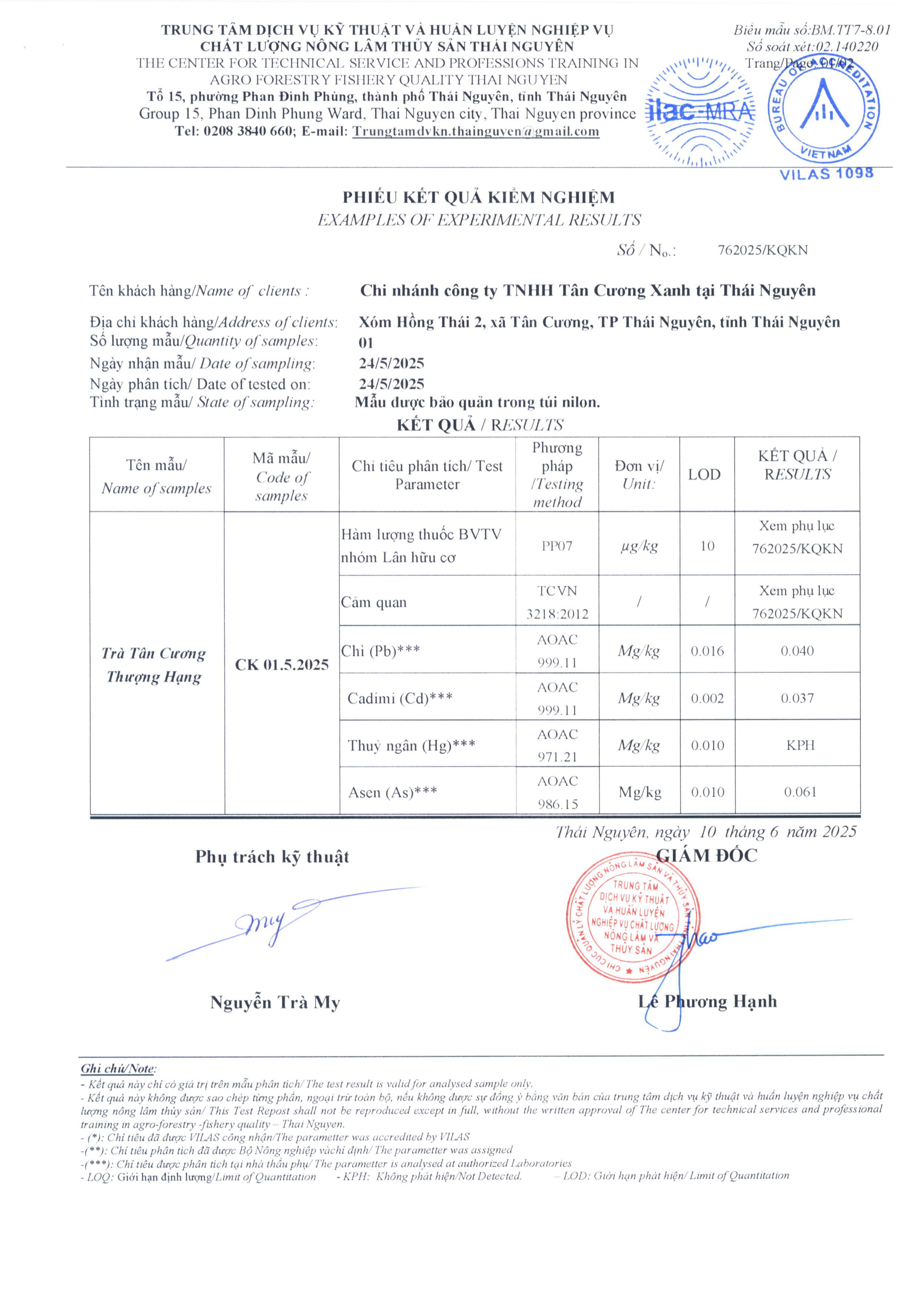 KẾT QUẢ XÉT NGHIỆM TRÀ TÂN CƯƠNG THƯỢNG HẠNG TC1