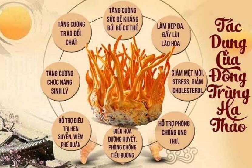 - Hỗ trợ điều trị thoái hóa, đau nhức xương khớp. Tác dụng đặc trị ho hen, ho có đờm. Đông trùng hạ thảo kháng viêm, kháng khuẩn, ngăn ngừa các loại virus viêm gan B, Lao, AIDS xâm nhập vào cơ thể.