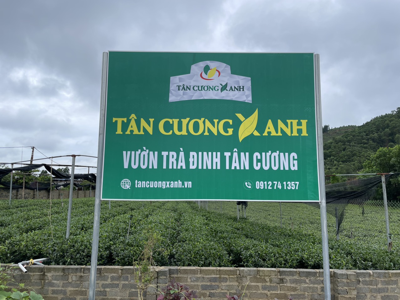 hình ảnh vườn trà đinh Tân Cương Xanh, vườn trà này đặc biệt, làm lưới che để điều chỉnh ánh sáng lượng mưa, bón dưới gốc đậu tương ủ, tưới bằng lòng đỏ trứng gà pha mật ong rừng theo công thức 10 lòng đỏ trứng gà + 1.5lit mật ong pha với 25l nước. Tưới 6 lần/ tháng.
