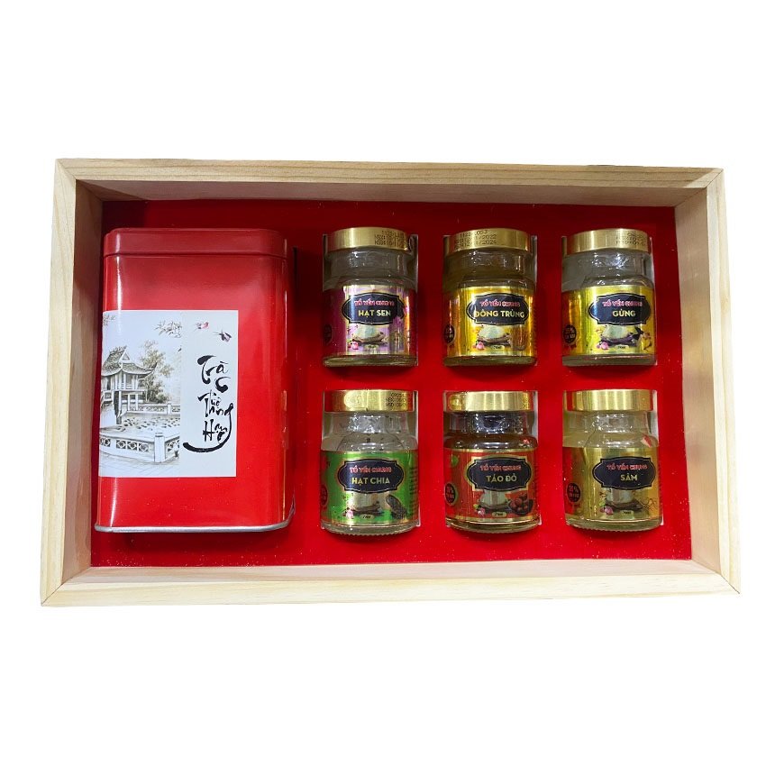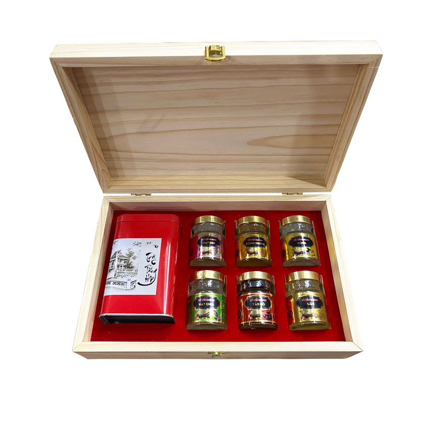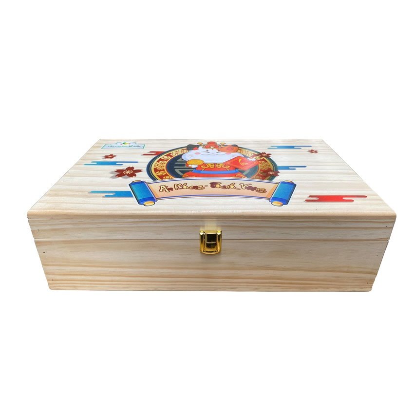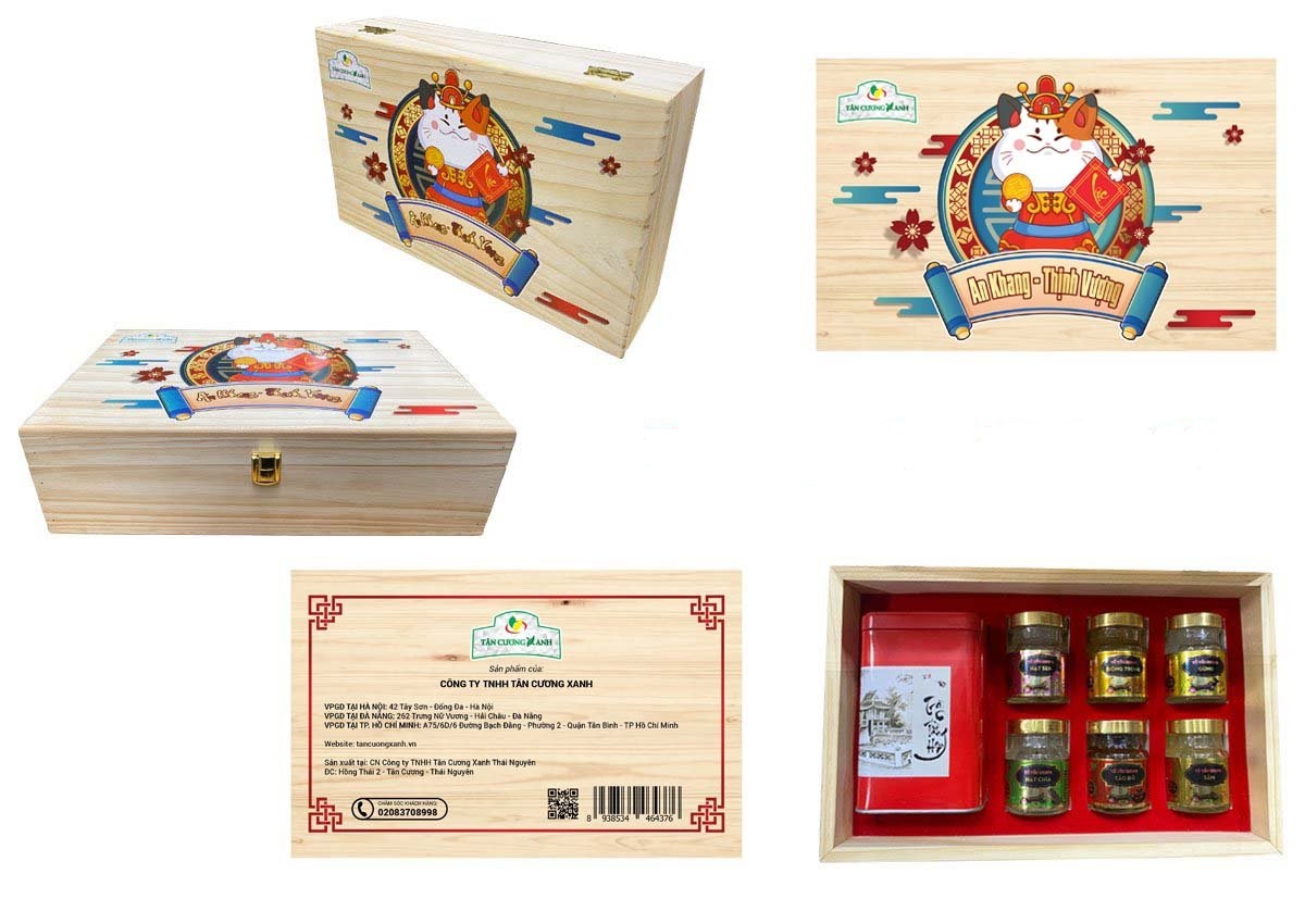 Sản phẩm Hộp Quà Tết An Khang được thiết kế gỗ thông in 7 mầu, bên trong là khay cao su non đỏ tạo nên độ sang trọng, sản phẩm tặng kèm túi xách ngoài nguyên bộ. Sản phẩm phù hợp làm quà biếu đối tác & khách hàng cao cấp.