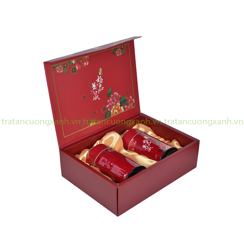 Hộp trà ô long hoàng kim với giá bán 630k/ hộp. Quy cách hộp được thiết kế vô cùng sang trọng với 2 mầu vàng kim và đỏ kim. Bên trong hộp là 2 hộp trà thiếc nhỏ, mỗi hộp đựng 200gram trà ô long cao cấp hút chân không. Đi kèm là túi giấy xách ngoài nguyên bộ