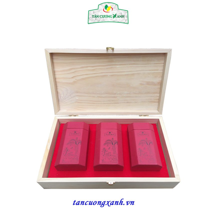Hộp trà ô long TCX2 - 300gram được bán với giá 680k/ hộp. Hộp được thiết kế chất liệu gỗ thông trắng Đà Lạt, bên trong hộp là 3 hộp trà nhỏ, mỗi hộp đựng 100gram trà. Hộp lót bởi cao su non, bên ngoài in hình tranh dân gian Đông Hồ nổi tiếng Việt Nam. Hộp trà ô long TCX-2 tạo ra kiệt tác sản phẩm trà ngon quà tặng mang đậm nét văn hoá Việt Nam