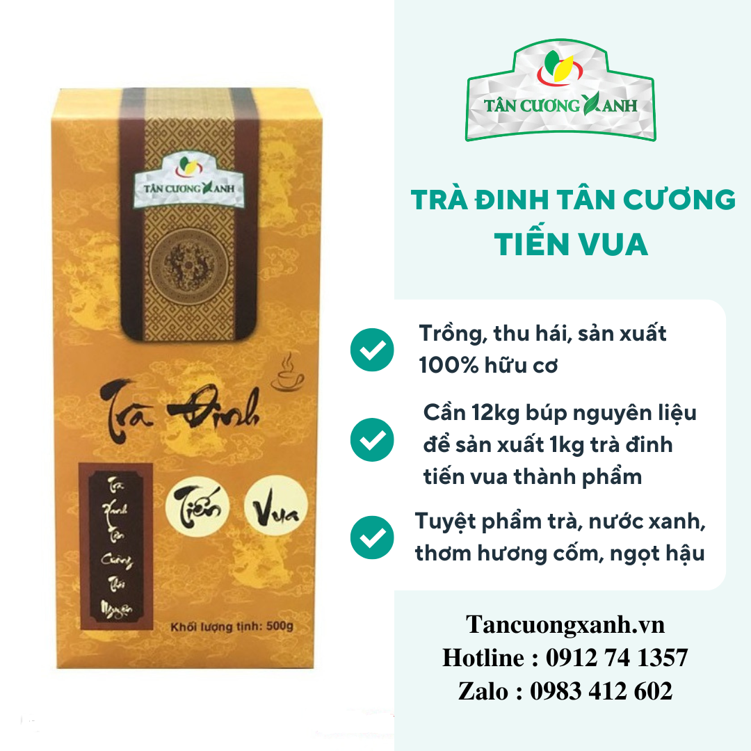 Trà đinh nhất là trà đinh tân cương là một thưởng phẩm trà xưa nay của trà thái nguyên. Trà đinh Tân Cương Xanh là thương hiệu trà đinh thái nguyên hảo hạng được khách hàng ưa chuộng chiều được những vị khách khó tính vì giữ được nguyên bản hương vị xưa. Để làm được điều này, các nghệ nhân Tân Cương Xanh đã có những yêu cầu vô cùng khắt khe trong quá trình thu hoạch trà nguyên liệu đến sao tay thủ công, bí kíp đánh hương gia truyền. Trồng trà đinh cũng đòi hỏi quy trình khắt khe, trồng trên vùng đất cao sơ với đường, trồng trên đất gan trâu, lợp lưới che để điều chỉnh nắng mưa, bón đậu tương ủ và tưới lòng đỏ trứng gà pha mật ong rừng 3 lần/ tháng. Trước 7 ngày khi hái cần tưới thêm 1 lần lòng đỏ trứng gà pha mật ong nữa. Đây là bí quyết trồng thu hái hoàn toàn hữu cơ để có nguồn nguyên liệu búp trà đinh thơm ngon để tiến hành vào sản xuất.