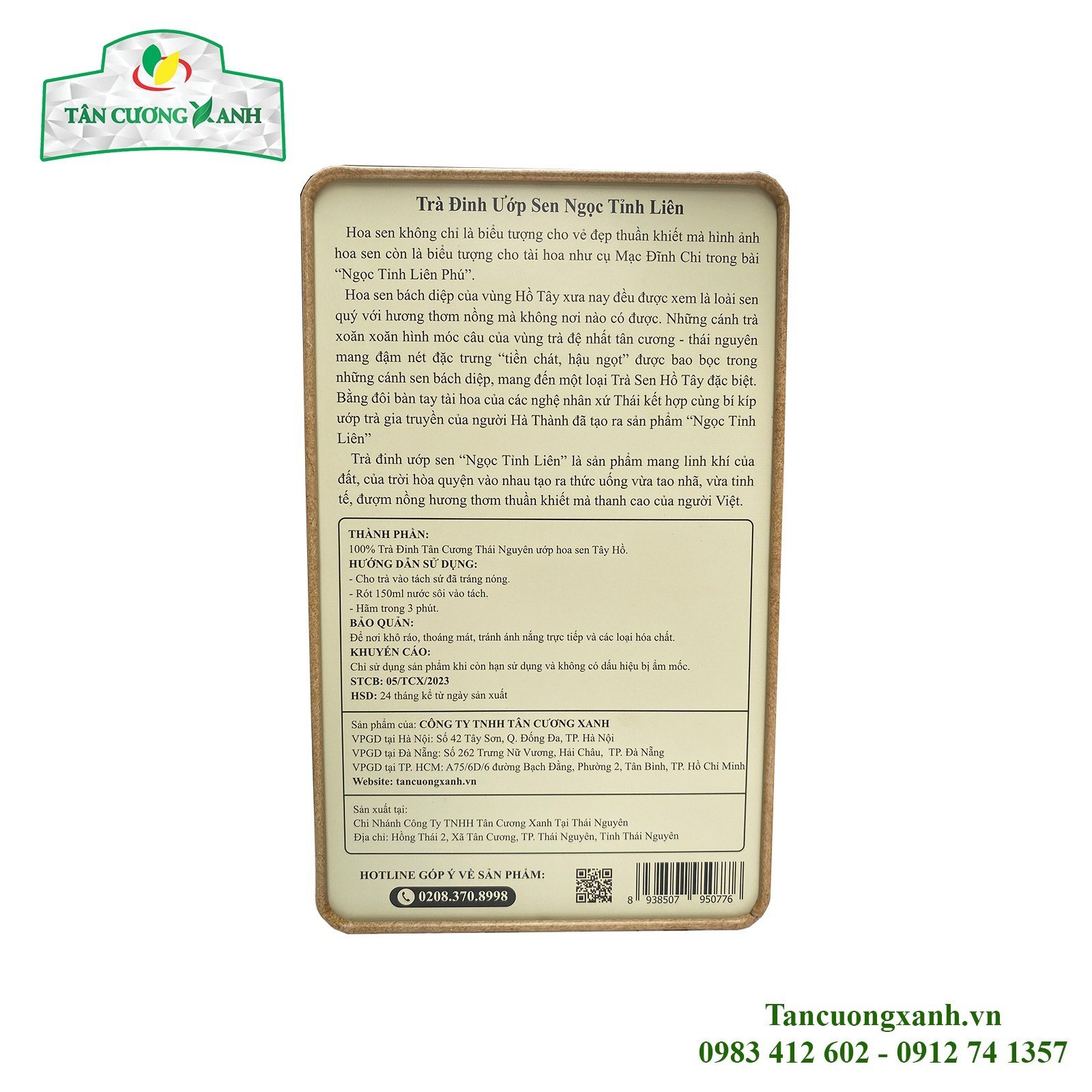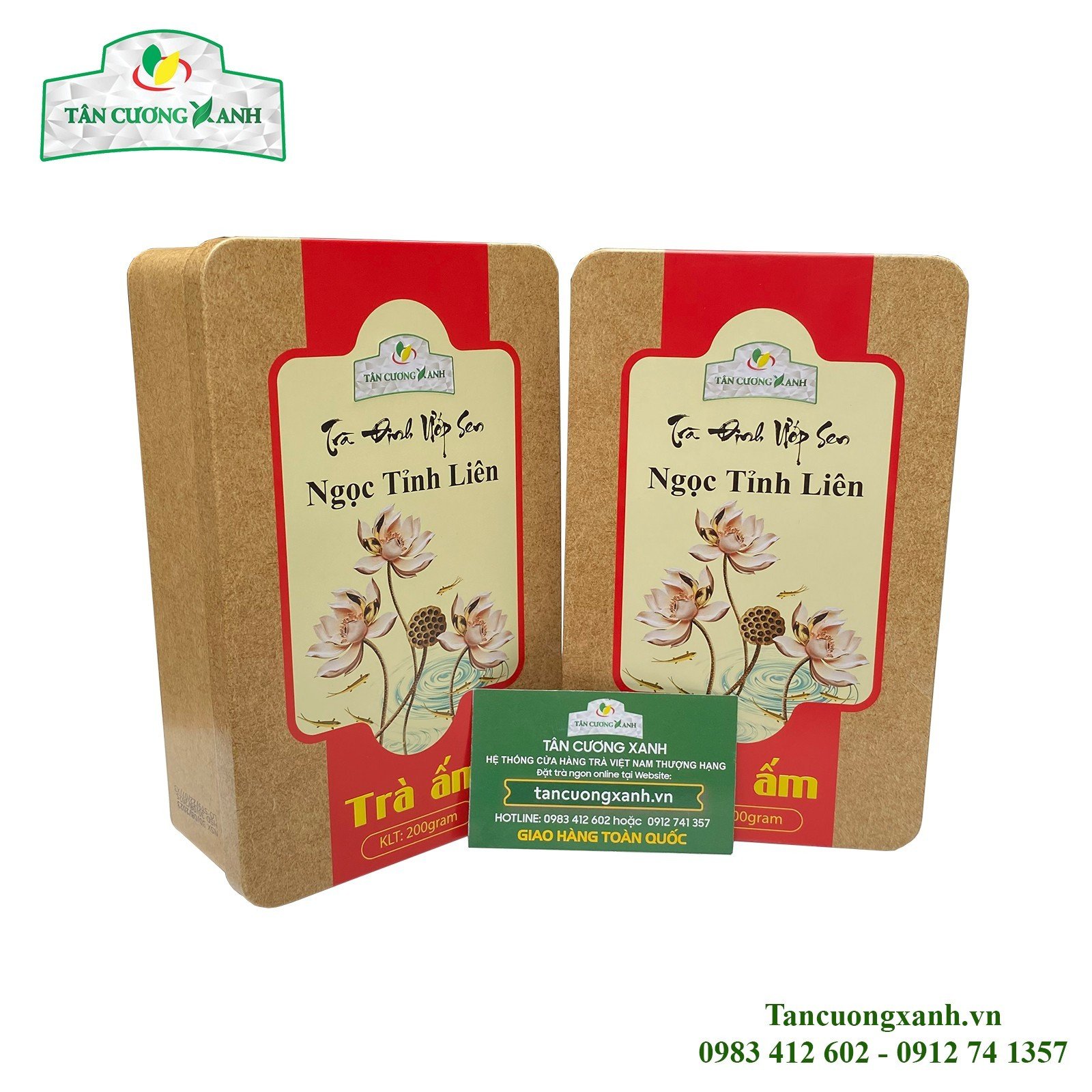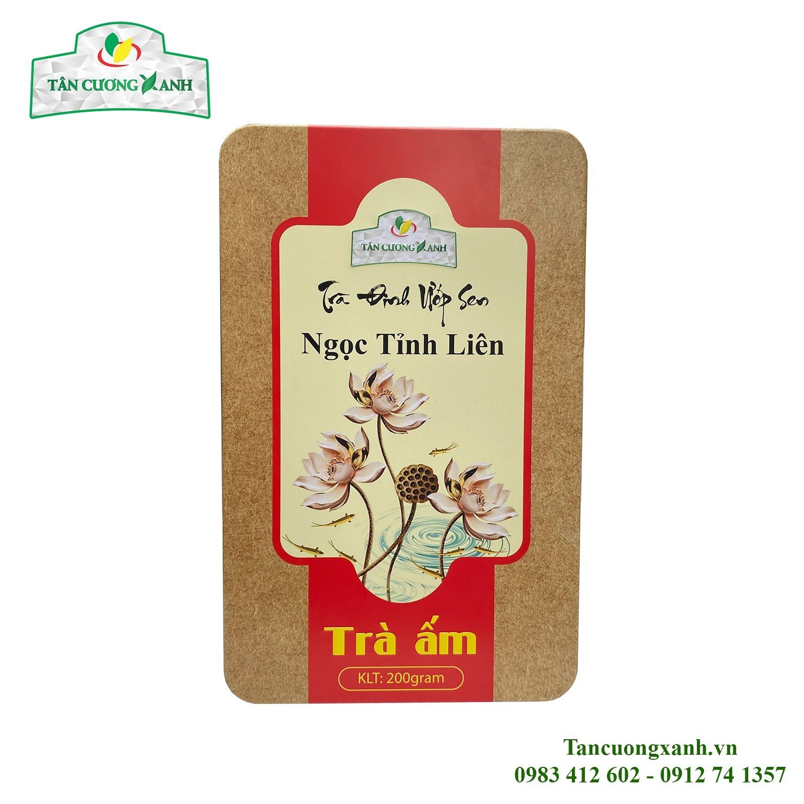 Trà sen Ngọc Tỉnh Liên là sản phẩm trà thơm ngon nhất của Tân Cương Xanh, sản phẩm được sản xuất bởi nguyên liệu búp trà tân cương thái nguyên và hoa sen Tây Hồ, sản phẩm được đóng gói theo quy cách trà ấm, mỗi hộp có 20 gói 10gram, mỗi gói 10gram sẽ pha được một ấm trà, vừa thơm ngon tiện dụng lại dễ bảo quản. Vỏ hộp kim loại in 7 mầu đẹp, đi kèm là túi giấy xách ngoài nguyên bộ.
