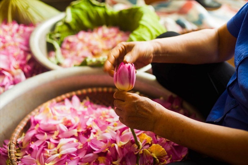 Quá trình làm trà bắt đầu từ lúc trời còn sớm. Những người làm nghề chèo thuyền ra hồ từ tinh mơ, chọn những bông sen vừa hé nở để giữ trọn hương thơm. Hoa sau khi hái được đưa về nhà, tách lấy gạo sen bằng tay. Công việc ấy đòi hỏi sự khéo léo và kiên nhẫn, bởi từng hạt gạo sen nhỏ bé cần được giữ nguyên vẹn để hương thơm lan tỏa trọn vẹn khi ướp trà.