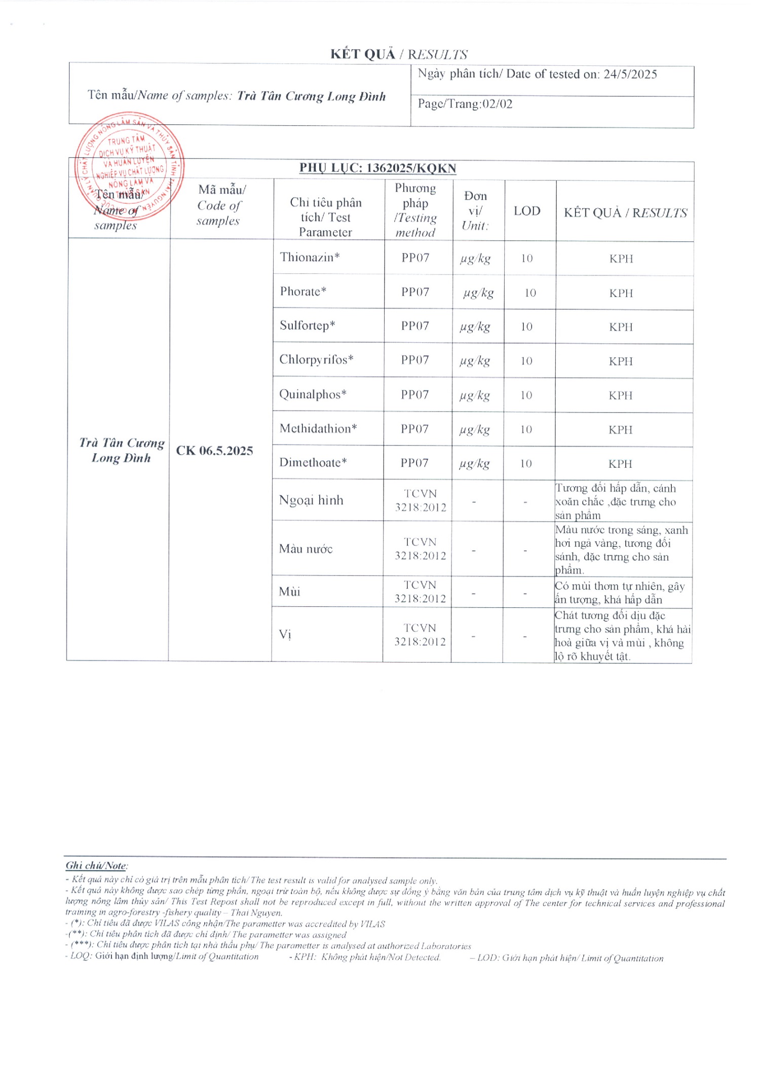 Kết luận: Trà Tân Cương Long Đình đạt tiêu chuẩn an toàn thực phẩm, không phát hiện tồn dư thuốc BVTV, các chỉ tiêu kim loại nặng ở mức cho phép, cảm quan tốt – đảm bảo chất lượng để sử dụng và làm quà tặng cao cấp.