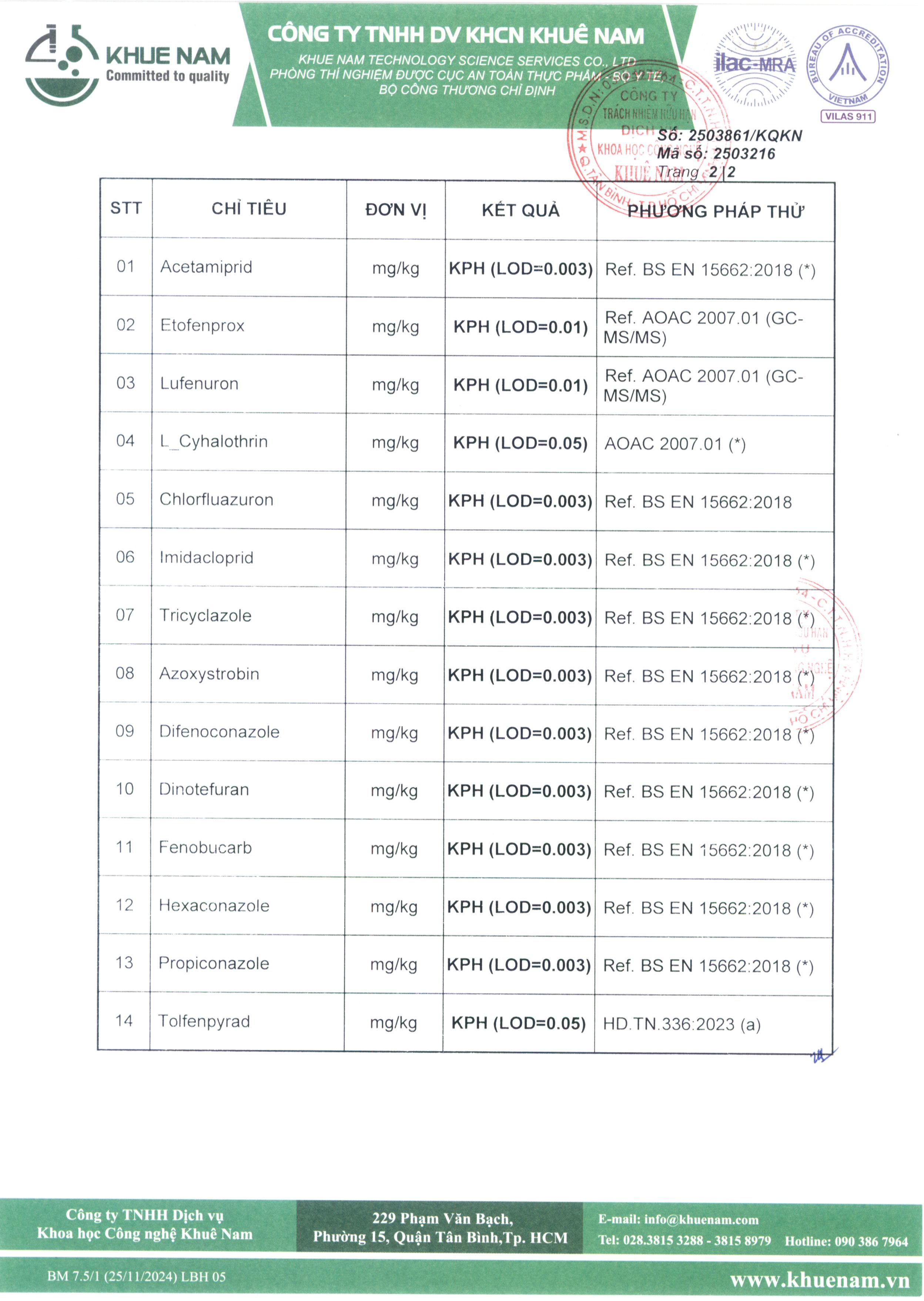 Kết quả cho thấy KHÔNG PHÁT HIỆN (KPH) 14 hoạt chất thuốc bảo vệ thực vật nguy hiểm thường gặp như: