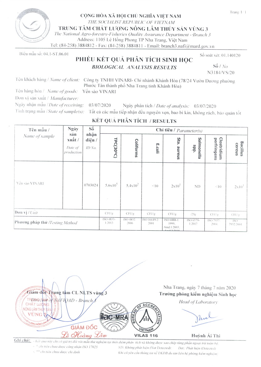 Tất cả sản phẩm Yến Sào Thượng Hạng - VinaRI bán ra đều được xét nghiệm và công bố Vệ Sinh An Toàn Thực Phẩm theo tiêu chuẩn của Bộ Y Tế